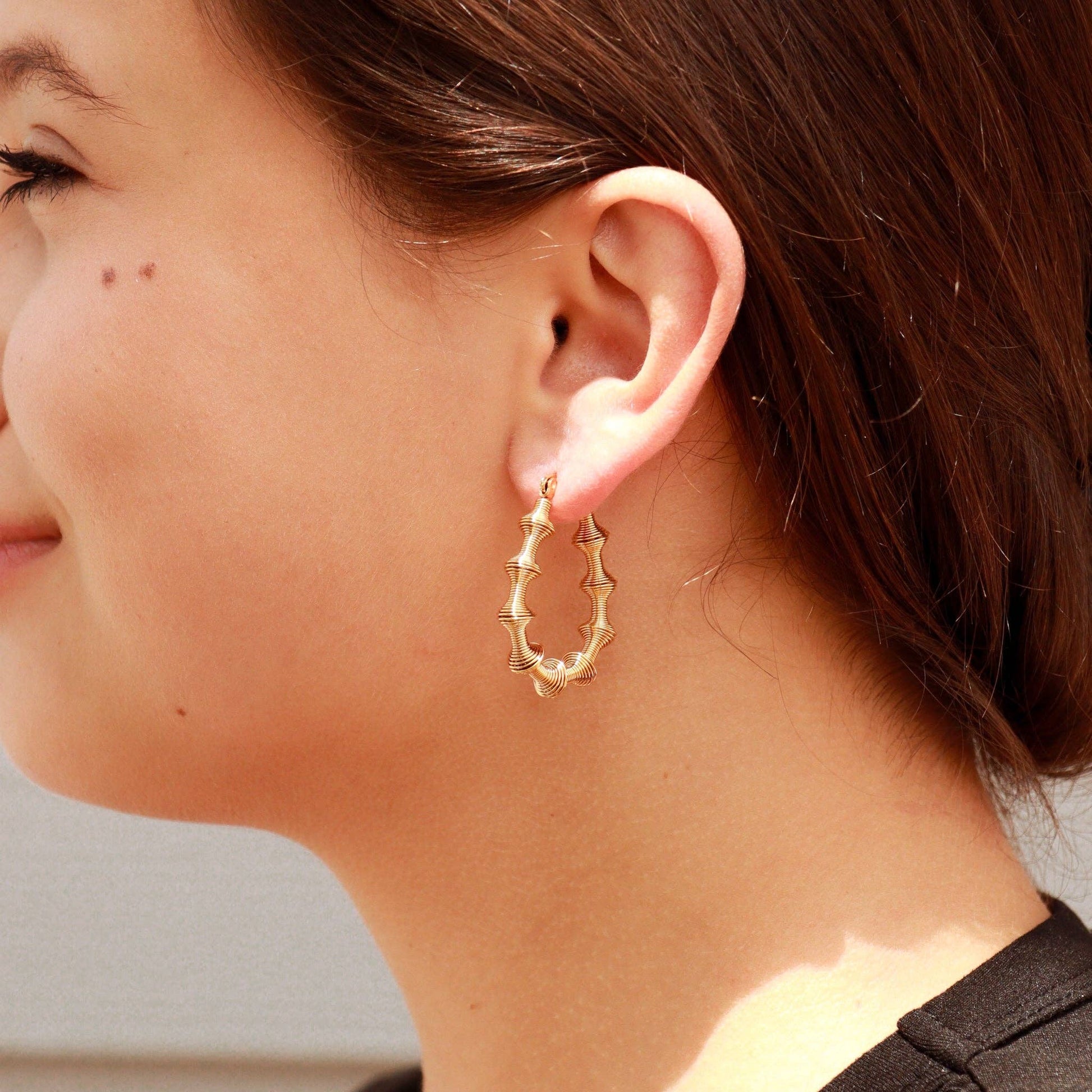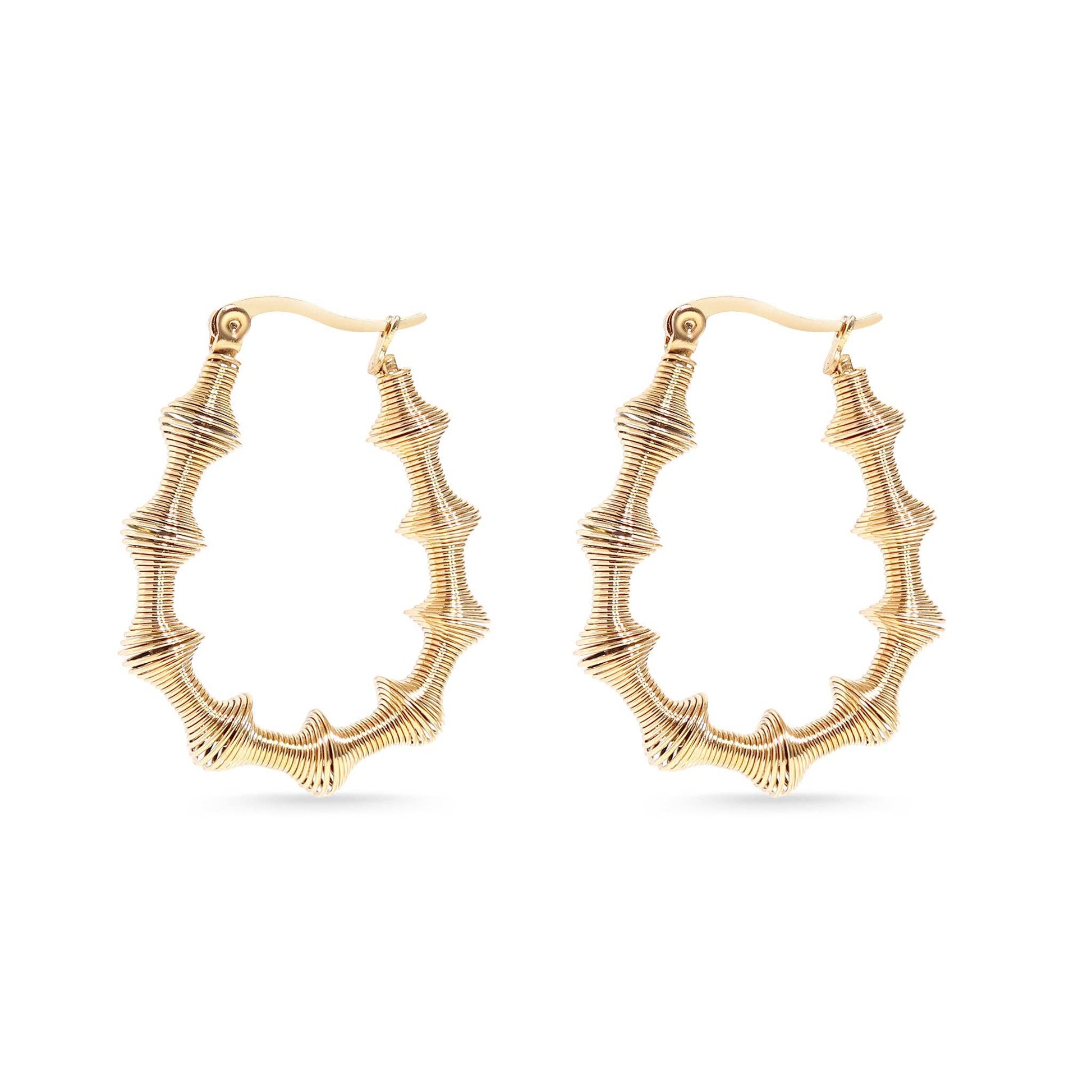 Make a bold statement with these 18K Gold PVD Wired Hoop Earrings, crafted from hypoallergenic 316L surgical steel for everyday elegance. The textured design strikes a perfect balance between refined simplicity and eye-catching dimension, transitioning seamlessly from day to evening. At just 6.5 grams, they're feather-light for all-day comfort. The advanced PVD coating ensures a lustrous, non-tarnish finish that resists discoloration and water damage, making them a durable investment piece. Dimensions: 25mm x 35mm, 3mm width.
