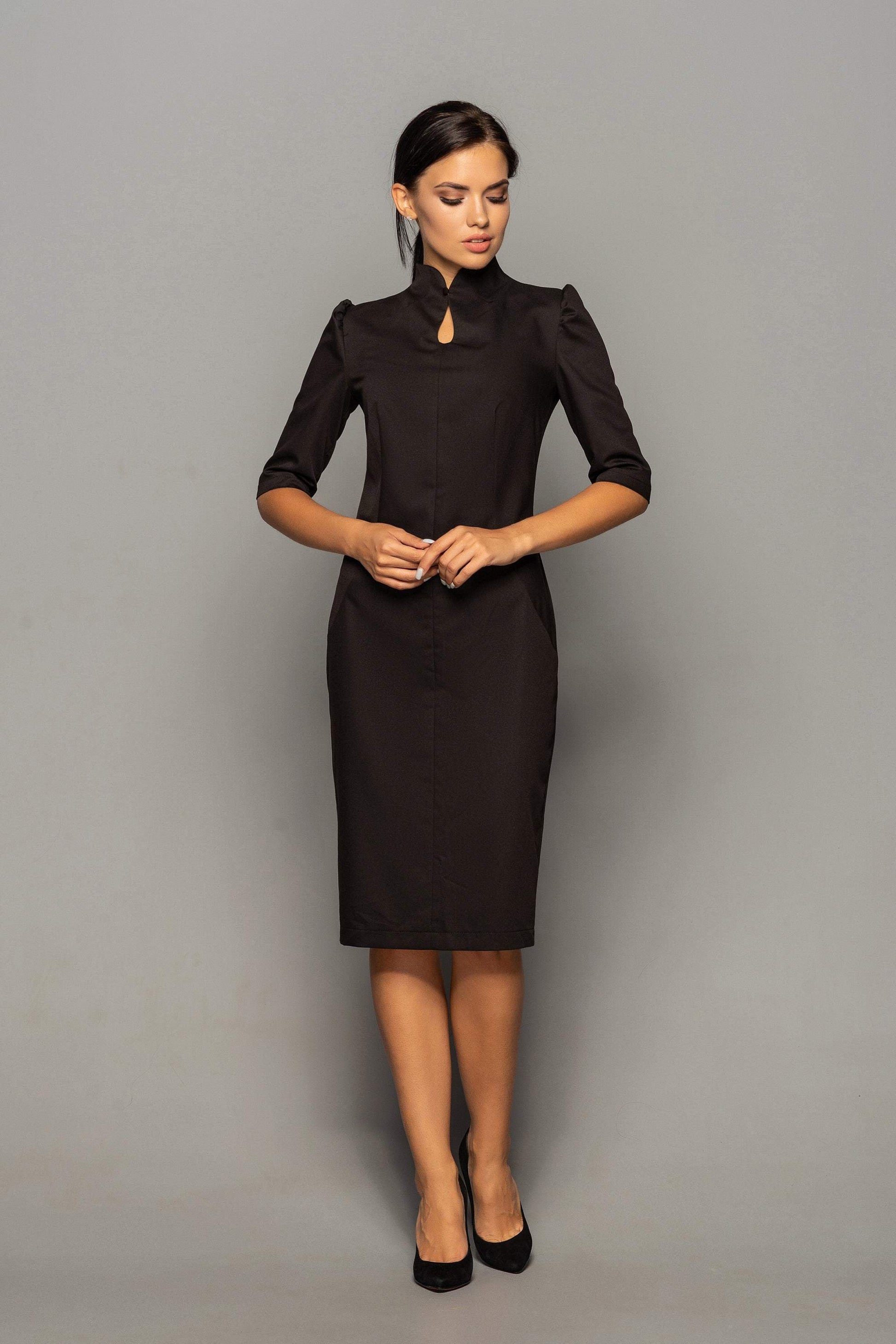 This contemporary cheongsam reimagines a classic silhouette with refined tailoring and thoughtful construction details. The dress features a precisely fitted pencil cut at midi length, anchored by a distinctive high mandarin collar with keyhole opening and fabric button closure. Three-quarter puffed sleeves provide subtle volume while maintaining the dress's streamlined aesthetic. French darts ensure superior shaping through the bodice, and a concealed back zipper allows for seamless dressing. The fabric composition—40% viscose, 5% elastane, and 55% polyester—delivers both breathability and recovery, offering comfort without compromising structure. This piece bridges heritage design with modern sensibilities, making it an essential addition to any sophisticated wardrobe.