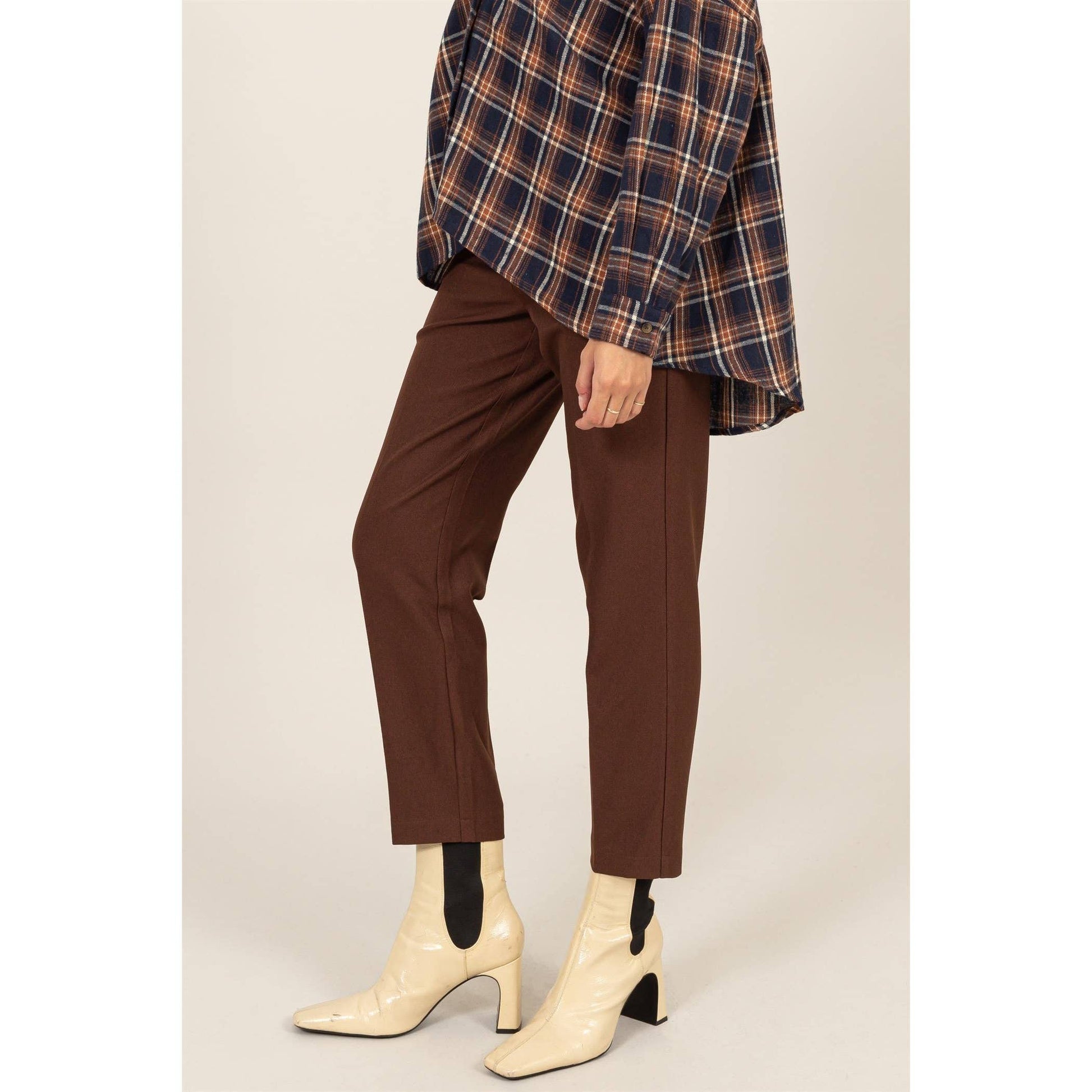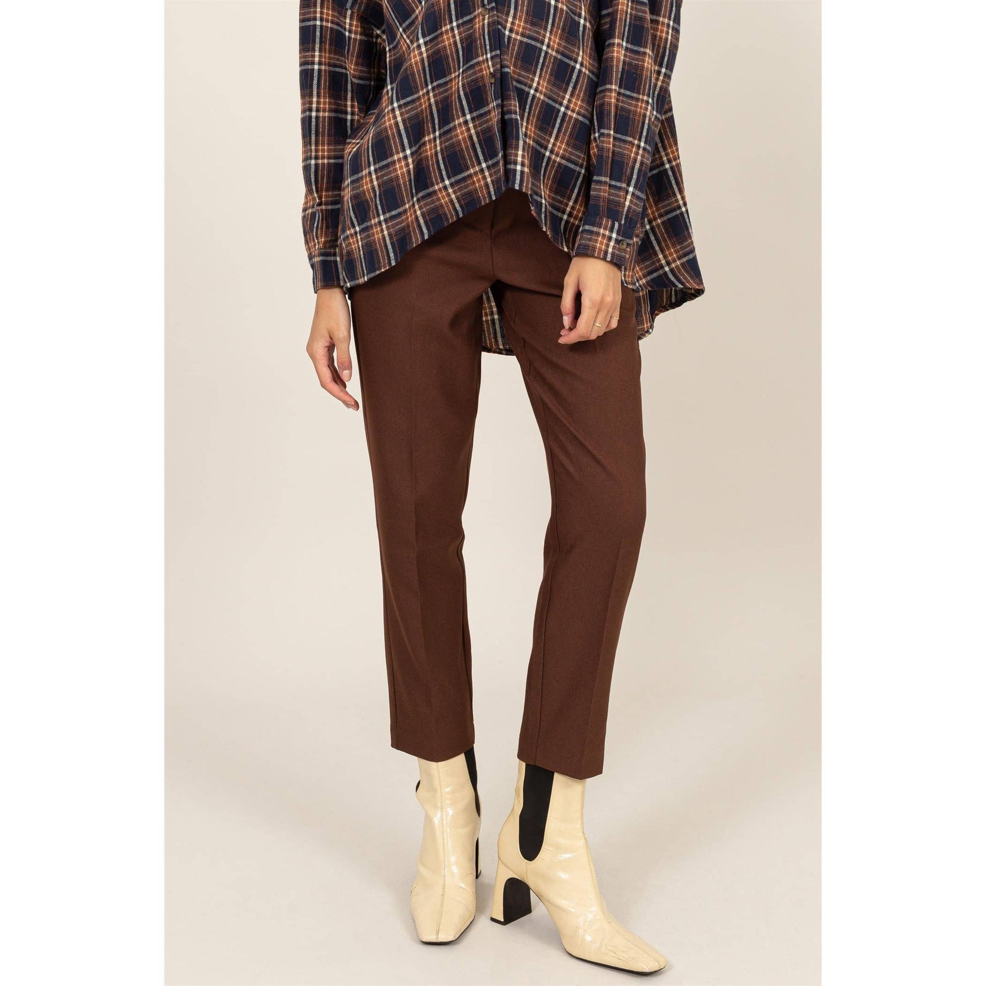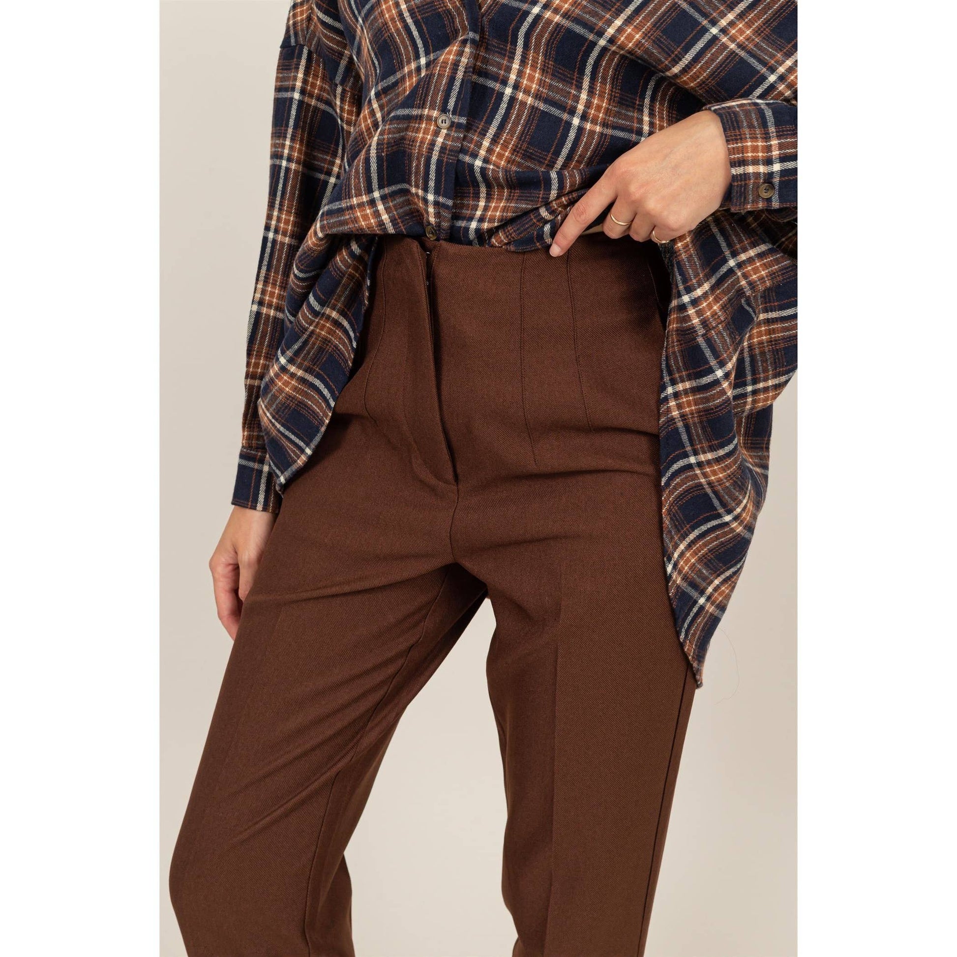 These HIGH-WAIST TAPERED PANTS are the perfect combination of comfort and style. The pleated design and tapered leg are accented in the front view, while the back view showcases a striking V-shaped waistband detail for a flattering silhouette. Made with 98% polyester, 2% Spandex, these pants are a must-have for any wardrobe.