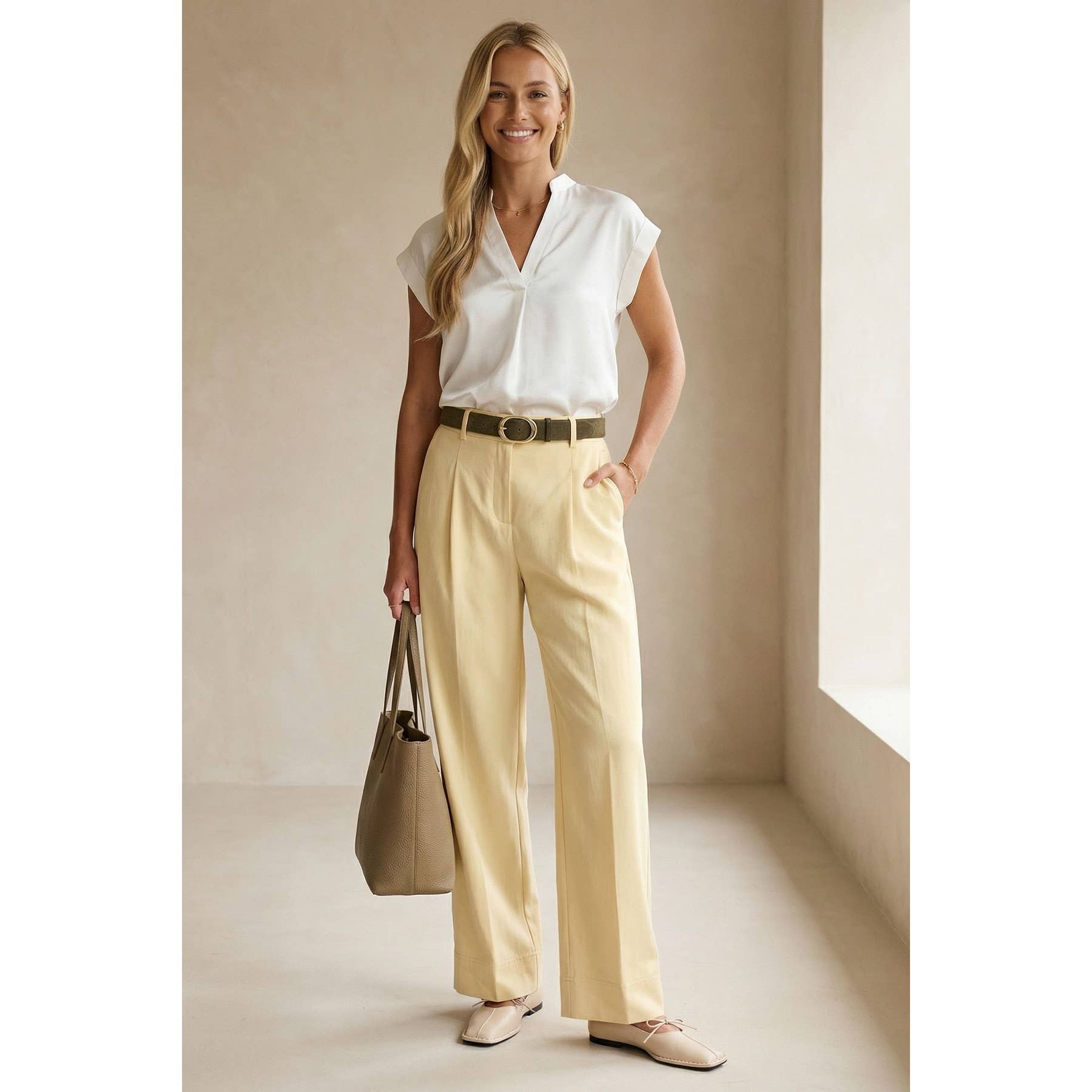 Women's Relaxed Cap Sleeve Satin Blouse Silky satin fabric with a smooth, elevated drape. V-neckline adds a flattering, feminine touch. Relaxed fit with cap sleeves for effortless polish. Style with tailored trousers for an easy office look or pair with denim for chic everyday wear. Fabric: Woven 100% Polyester