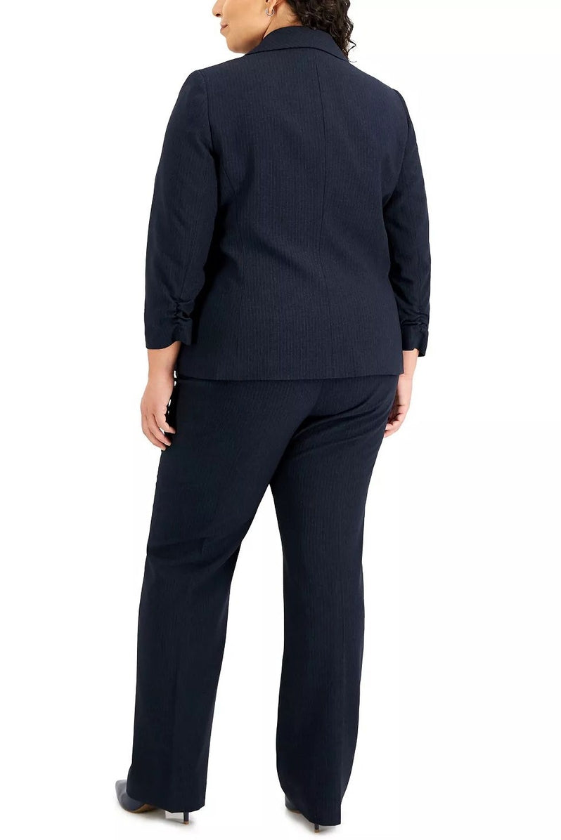 This suit features a notched shawl lapel collar, one-button closure, shoulder pads, and a mid-waist zip with a hook and bar closure on the pants. Made of 100% polyester crepe with polyester lining for both blazer and pants. Light weight for all season