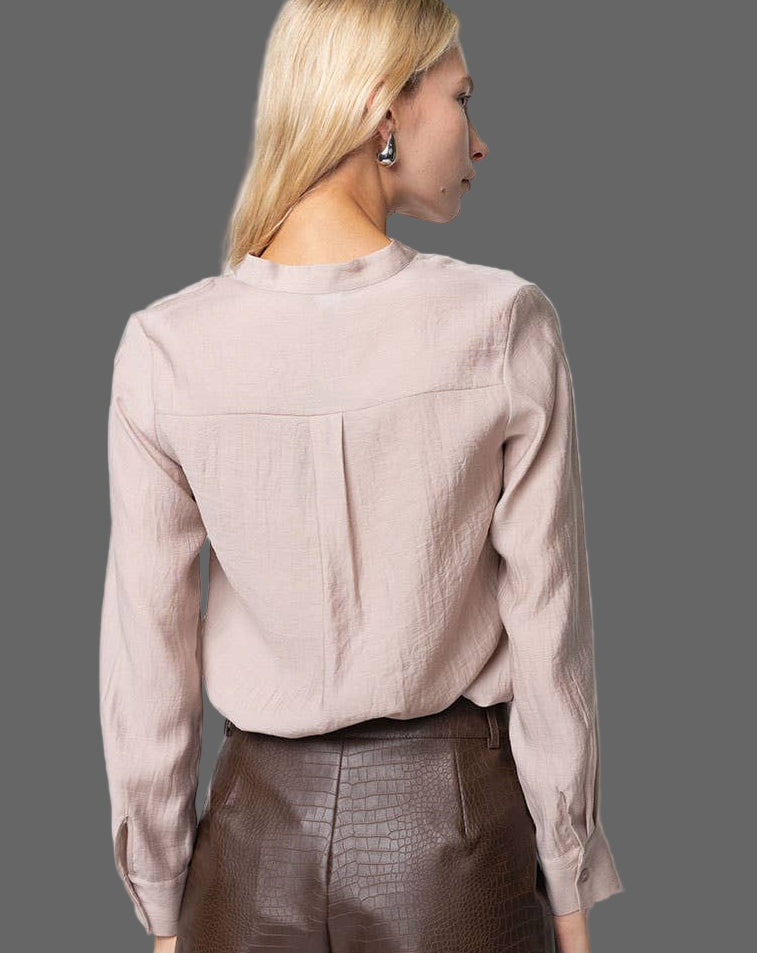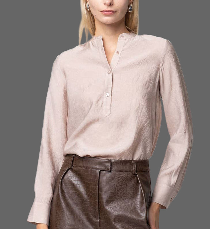 The Band Collar Blouse with Half-Placket offers a modern twist on classic elegance. Featuring a sleek band collar and a half-placket design, this blouse combines a minimalist aesthetic with practical functionality. Ideal for both professional and casual occasions, it adds a touch of contemporary style to your wardrobe. Fabric: Woven 53% Cotton 41% Tencel 6% Wool.